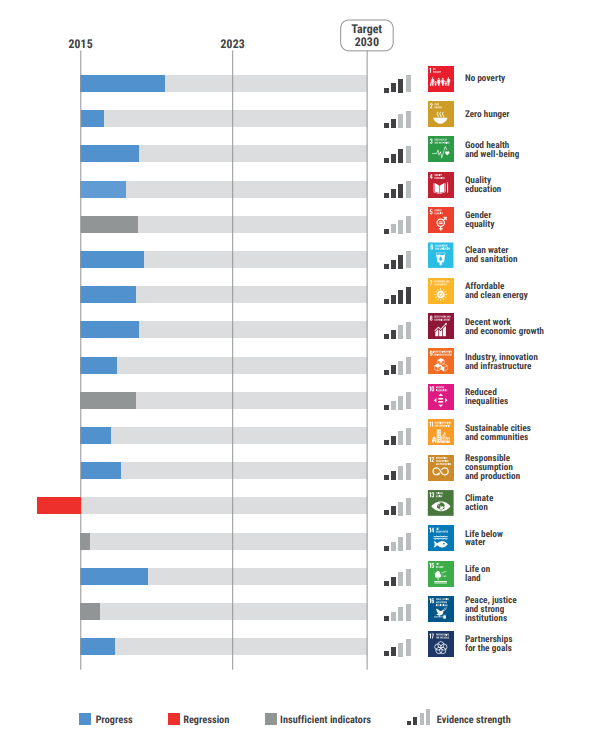 Sementara itu, kemajuan sudah terlihat pada zero hunger (Goal 2), good health and well-being (Goal 3), quality education (goal 4), affordable and clean energy (Goal 7) and reduced inequalities (Goal 10). Namun, progress paling sedikit dicapai sejak tahun 2015 untuk decent work and support economic growth (Goal 8), responsible consumption and production (Goal 12), life below water (Goal 14), life on land (Goal 15), dan partnerships for the goals (Goal 17) sehingga masih memerlukan perhatian yang besar.
