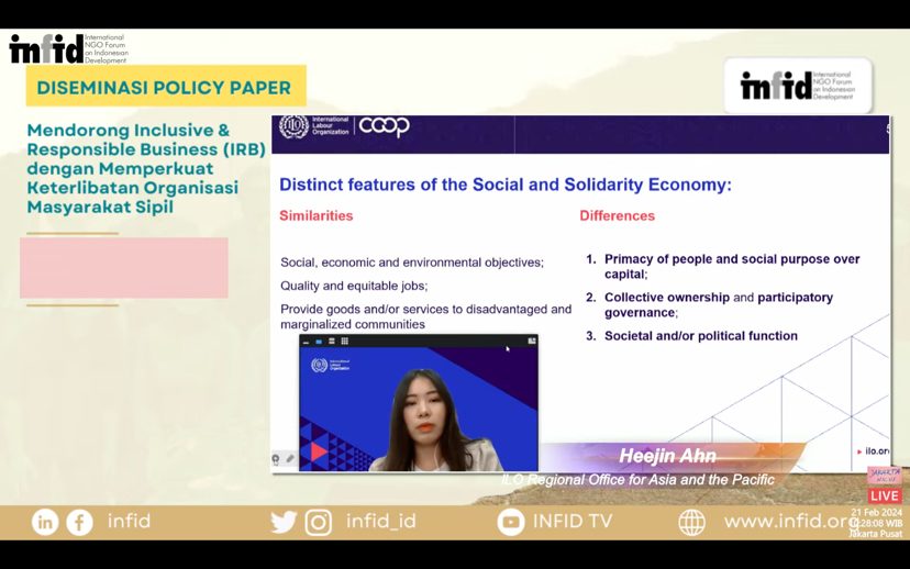 “Terdapat beberapa persamaan dan perbedaan antara IB-IRB dan SSE. Ada ciri-ciri yang membedakan dan serupa. Secara umum, semua ini berkontribusi terhadap tujuan pembangunan berkelanjutan dengan menyediakan pekerjaan yang adil dan berkualitas. Namun, yang membedakan adalah SSE berorientasi pada manusia dalam operasionalnya bukan sekedar profit. Ciri yang kedua adalah SSE berangkat dari tata kelola yang partisipatif. Misalnya ada perusahaan yang fokus pada pemberdayaan.” jelas Ahn. Ia menambahkan, bahwa penting juga bagi OMS untuk menonjolkan fungsi sosial dan politiknya, yaitu dimulai dari membantu proses komunikasi dengan pemerintah secara efektif untuk menyelesaikan permasalahan bisnis saat ini.