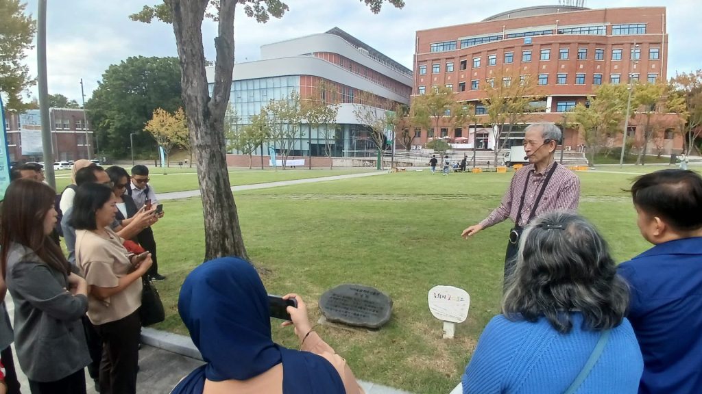 Peserta diajak mengunjungi Chonnam National University, sebuah institusi pendidikan yang menjadi saksi sejarah pemberontakan “Gwangju Uprising”. Professor Shin Gyonggu, Executive Director Gwangju International Center, mengatakan peristiwa “Gwangju Uprising” berawal di kampus ini (Gambar 1). Sejumlah aksi protes dilakukan oleh mahasiswa sebagai aksi penolakan terhadap kebijakan pemerintah Korea Selatan kala itu, hingga berujung dengan bentrokan antara mahasiswa dan militer. Sebagai upaya memorialisasi peristiwa pelanggaran HAM yang terjadi, terdapat berbagai monumen dan karya seni yang dibangun di berbagai sudut kampus, seperti monumen batu (Gambar 2) dan mural (Gambar 3).