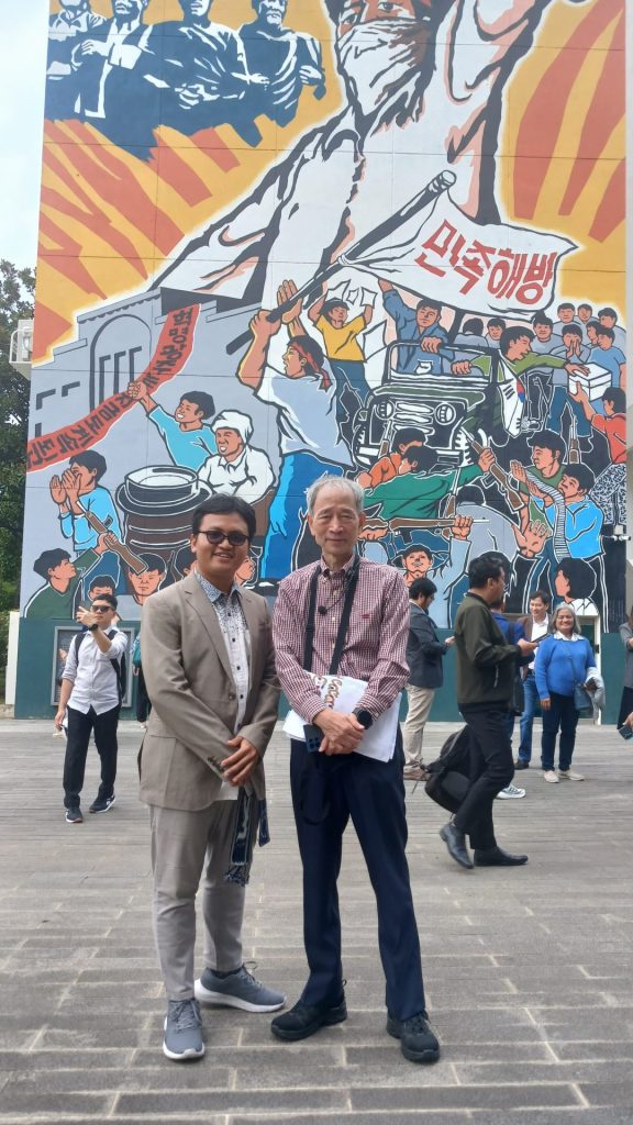 Gambar 3. Program Officer Peacebuilding and Youth Empowerment INFID, Hendrikus Rizky Visanto Putro (kiri) tengah berfoto dengan Professor Shin Gyonggu (kanan) di depan mural peringatan Gwangju Uprising di Chonnam National University
