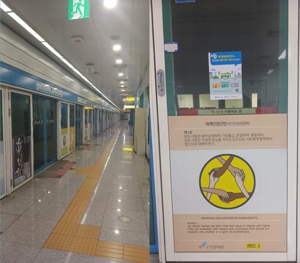 Gambar 6. Situasi di stasiun kereta bawah tanah KDJ Convention Center (kiri) dan infografis sederhana tentang Deklarasi Universal HAM di pintu stasiun (kanan)
