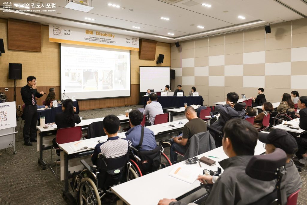 Diskusi paralel yang selanjutnya mengangkat tema ruang sipil sebagai desain universal dan HAM bagi penyandang disabilitas (Gambar 9). Sebagai sebuah kota yang mengadopsi konsep Kabupaten/Kota HAM, fitur sosial yang signifikan perlu difokuskan pada upaya untuk memastikan hak atas akses terhadap kondisi kehidupan bagi semua warga negara. Sesi ini membahas contoh kasus aksesibilitas dan desain universal dari kota-kota di berbagai belahan dunia, serta tantangan dan strategi kebijakan desain universal di Korea untuk menjamin aksesibilitas serta kesetaraan bagi penyandang disabilitas. Tujuan dari sesi ini adalah mendorong desain universal yang memungkinkan keterlibatan semua warga tanpa terkecuali di ruang publik.